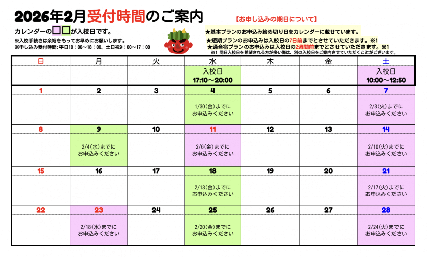 2月は毎週水曜日と土曜日に加えて以下の日程も入校式を実施いたします。